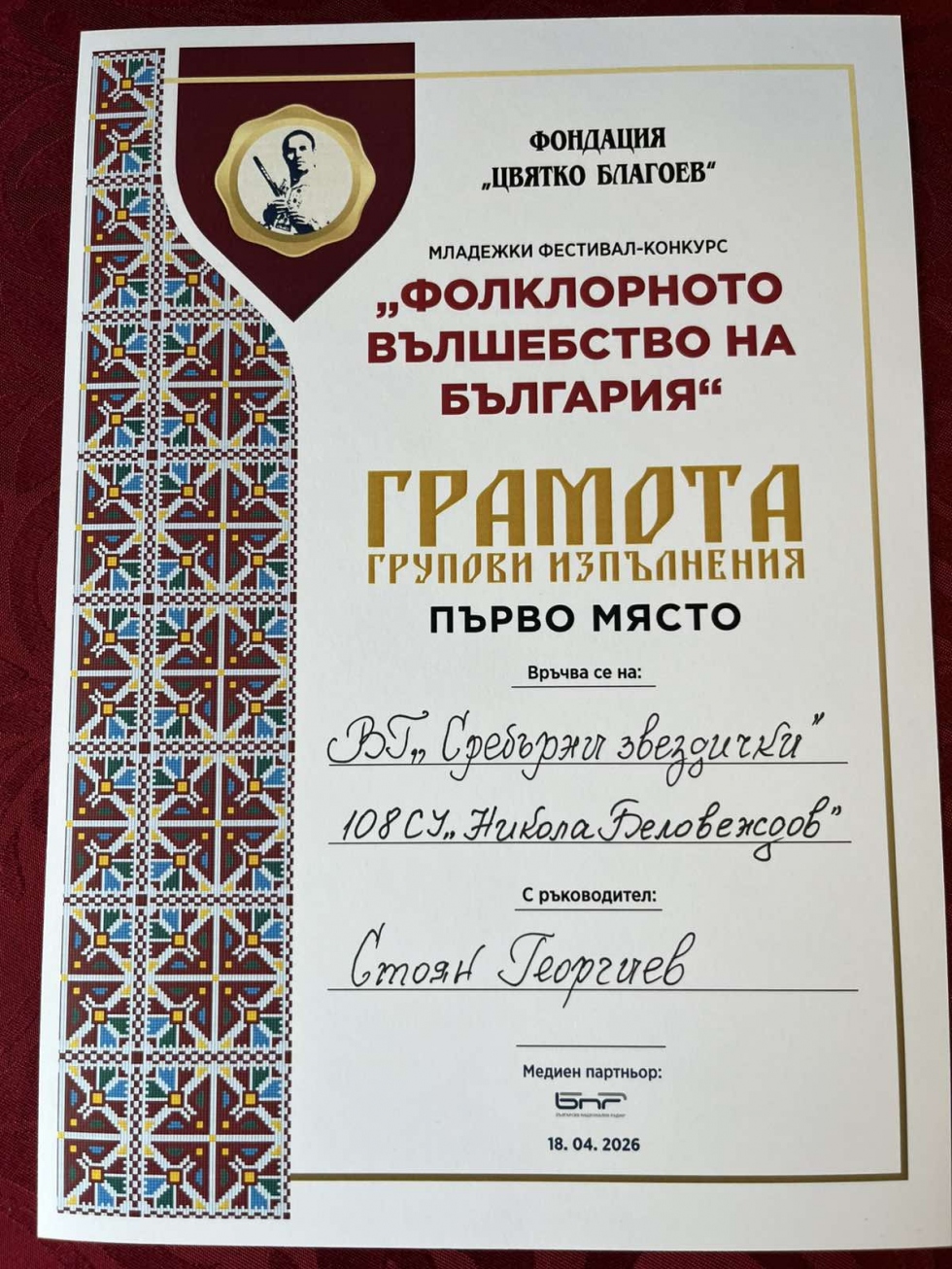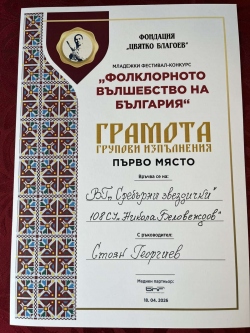 С гордост споделяме, че вокална група „Сребърни звездички“ с ръководител Стоян Георгиев завоюва първо място в категория „Вокално изкуство“.